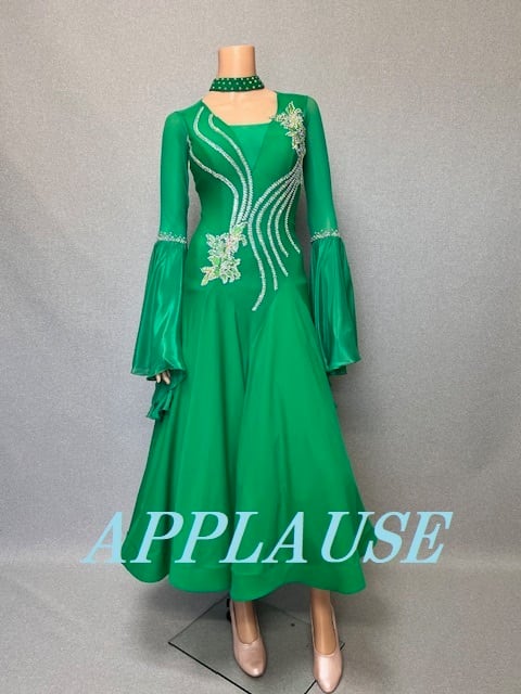 【新着】パーティードレス 社交ダンス ドレス スタンダード モダンドレス ライトグリーン(ベルスリーブ)M ST-25-12 デモ・競技用ドレス 発表会衣装 パーティドレス ワンピース 舞台衣装