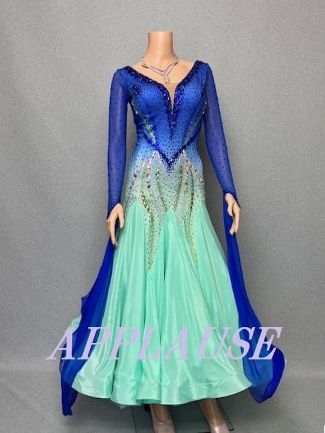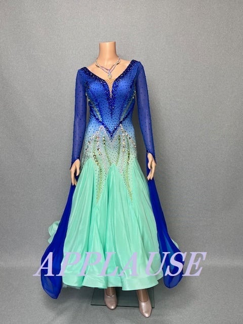 【新着】社交ダンス ドレス スタンダード モダンドレス ブルー×グリーン M ST-25-15 デモ・競技用ドレス 発表会衣装 パーティドレス ワンピース 舞台衣装