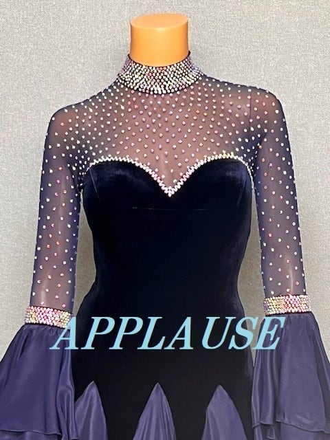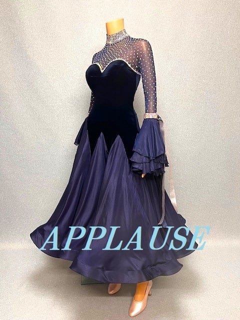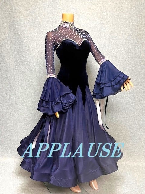 【新着】社交ダンス ドレス スタンダード モダンドレス ネイビーベルベット(袖フリル) M ST-25-21 デモ・競技用ドレス 発表会衣装 パーティドレス ワンピース 舞台衣装
