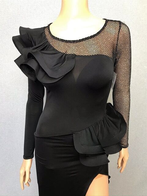 「ブロードウェイ フリル」のドレス名どおり、ラテンインパクトが有り、左足の深いスリット、体型カバーも兼ねた華やかで大ぶりなフリル(フリルにはホースヘアを入れフリルラインを形成しています)、ラメ入りフィッシュネット等、スタイリッシュで、スタイルが良く見えるドレスです。
