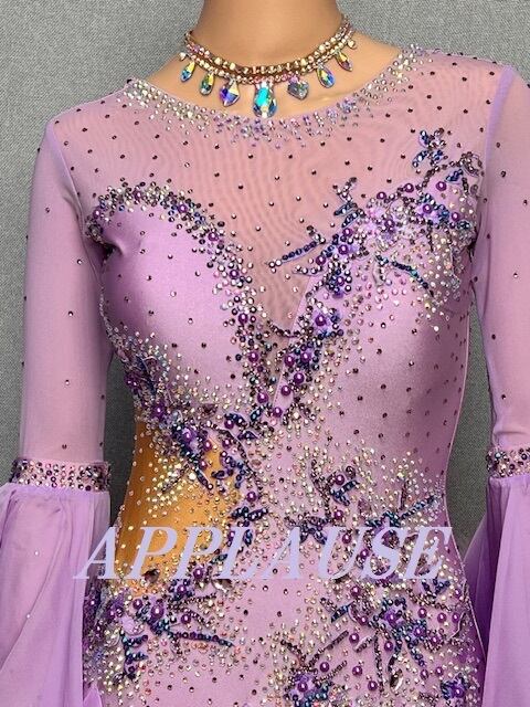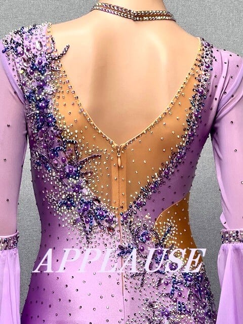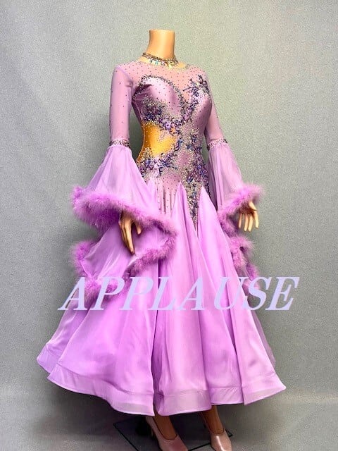 【新着】社交ダンス ドレス スタンダード モダンドレス ラベンダー(袖ファー) M ST-25-3 デモ・競技用ドレス 発表会衣装 パーティドレス ワンピース 舞台衣装