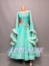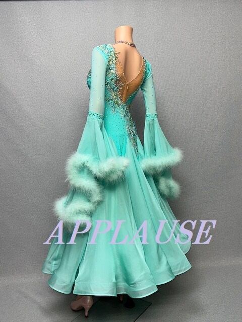 新着】社交ダンス ドレス スタンダード モダンドレス アップルグリーン(袖ファー) M ST-25-4 デモ・競技用ドレス 発表会衣装 パーティドレス ワンピース 舞台衣装